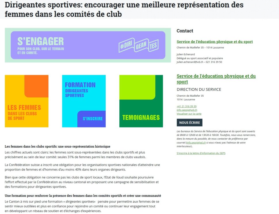 Bien que cette obligation ne concerne pas les clubs de sport locaux, l’Etat de Vaud souhaite poursuivre l’effort effectué par la Confédération au niveau cantonal en proposant une campagne de sensibilisation et des formations pour dirigeantes sportives.