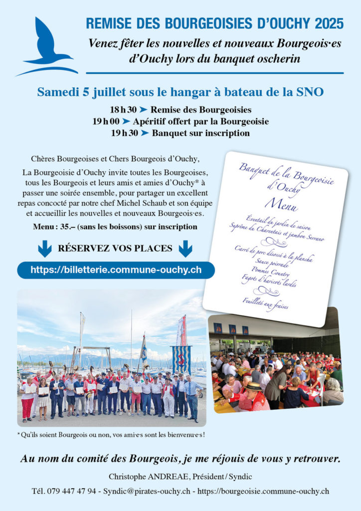Venez fêter les nouvelles et nouveaux Bourgeois.es d’Ouchy lors du banquet Oscherin le samedi 5 juillet sous le hangar de la vénérable Société Nautique d’Ouchy.