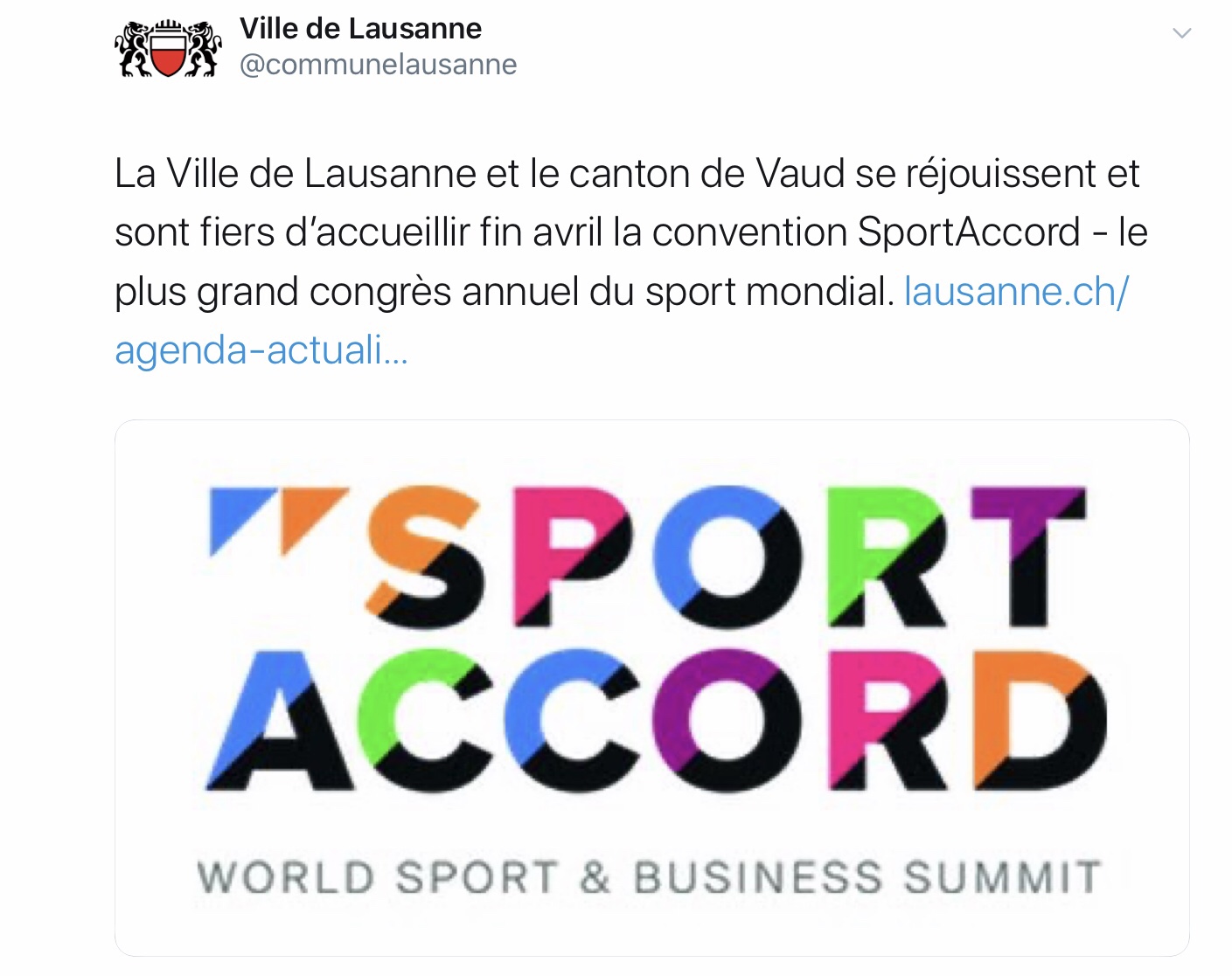 La Ville de Lausanne et le canton de Vaud se réjouissent et sont fiers d’accueillir fin avril la convention SportAccord – le plus grand congrès annuel du sport mondial. site… Lire la suite